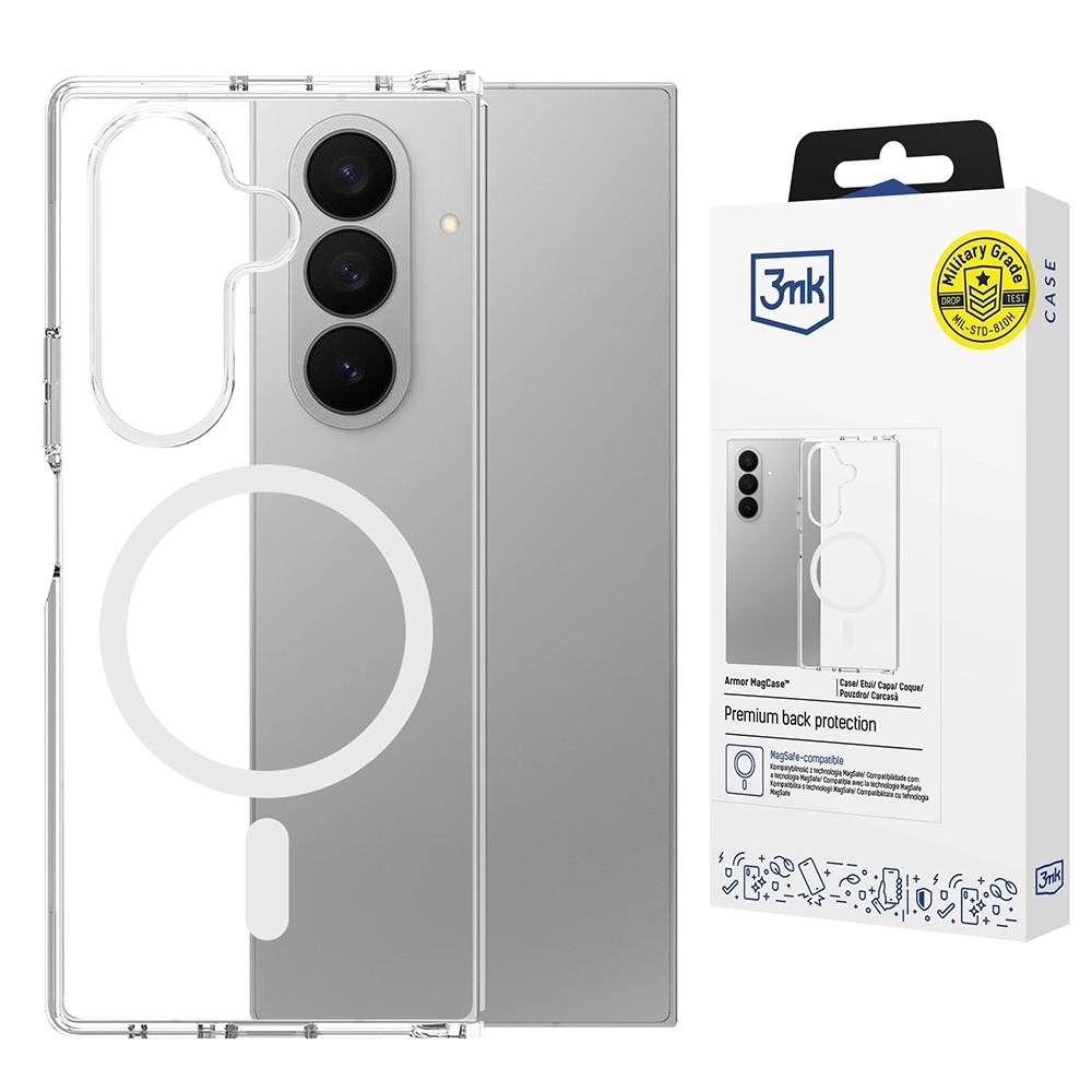 Kryt 3mk Clear Case se vyznačuje křišťálově čistým provedením, které nechá vyniknout elegantní design vašeho Samsung Galaxy Z Fold7. Je vyroben z čirého polykarbonátu na zádech, který zajišťuje vysokou odolnost proti poškrábání a nárazům, zatímco flexibilní rámeček usnadňuje nasazení a sejmutí krytu. Precizní výřezy jsou samozřejmostí, a to jak pro sofistikovaný kamerový modul, tak pro všechny porty a tlačítka, která jsou navíc vybavena technologií EasyClick™ pro citlivou a pohodlnou odezvu. Kryt je navržen tak, aby byl co nejtenčí a nejpraktičtější, přesto splňuje přísnou pádovou normu Absorber125™, což garantuje odolnost při 26 pádech z výšky 125 cm. Na zadní straně je patrný kruhový design, který naznačuje kompatibilitu s magnetickým příslušenstvím, což rozšiřuje funkčnost vašeho telefonu.