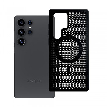 Design 3mk COOLing MagCase je promyšlený do posledního detailu. Pouzdro se pyšní matným černým provedením, které dodává telefonu sofistikovaný vzhled a zároveň zajišťuje příjemný úchop. Celou zadní stranu zdobí výrazný geometrický perforovaný vzor, připomínající jemnou síťovinu. Tato struktura není jen estetická – je klíčová pro efektivní odvod tepla, což je hlavní předností tohoto modelu. Uprostřed zadní části je elegantně integrován kruhový prvek pro MagSafe kompatibilitu, který umožňuje snadné a pevné přichycení MagSafe příslušenství. Přesné výřezy pro fotoaparáty, porty a tlačítka zajišťují plnou funkčnost a pohodlné ovládání vašeho Samsung Galaxy S25 Ultra.