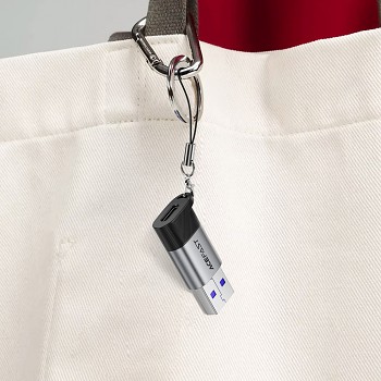 Design adaptéru Acefast J8 je promyšlen do posledního detailu. Kovově šedé tělo dodává adaptéru prémiový vzhled a zároveň zajišťuje vysokou odolnost proti opotřebení. Černá, texturovaná část nejenže vytváří zajímavý vizuální kontrast, ale také zlepšuje úchop. Adaptér je navíc vybaven praktickým poutkem s kovovou karabinou, díky kterému jej můžete snadno připevnit ke klíčům, batohu nebo tašce a mít jej tak vždy po ruce.