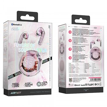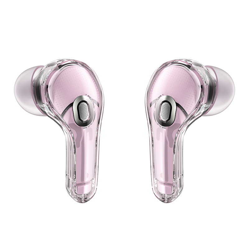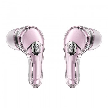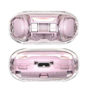 Sluchátka Acefast T8 se pyšní unikátním transparentním designem, který odhaluje jejich vnitřní krásu a precizní zpracování. Nabíjecí pouzdro má zaoblený, kompaktní tvar a jeho průhledný exteriér doplňuje vnitřní komponenty v jemné lotosově růžové barvě. Dominantou pouzdra je digitální LED displej, který přehledně zobrazuje zbývající procenta baterie a stav nabíjení jednotlivých sluchátek (L/R). Samotná sluchátka jsou navržena s důrazem na ergonomii a pohodlí, s průhlednými stopkami a silikonovými špunty, které zajišťují stabilní usazení v uchu a efektivní izolaci okolního hluku. Celkový vzhled působí moderně a sofistikovaně, s nádechem luxusu.