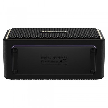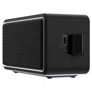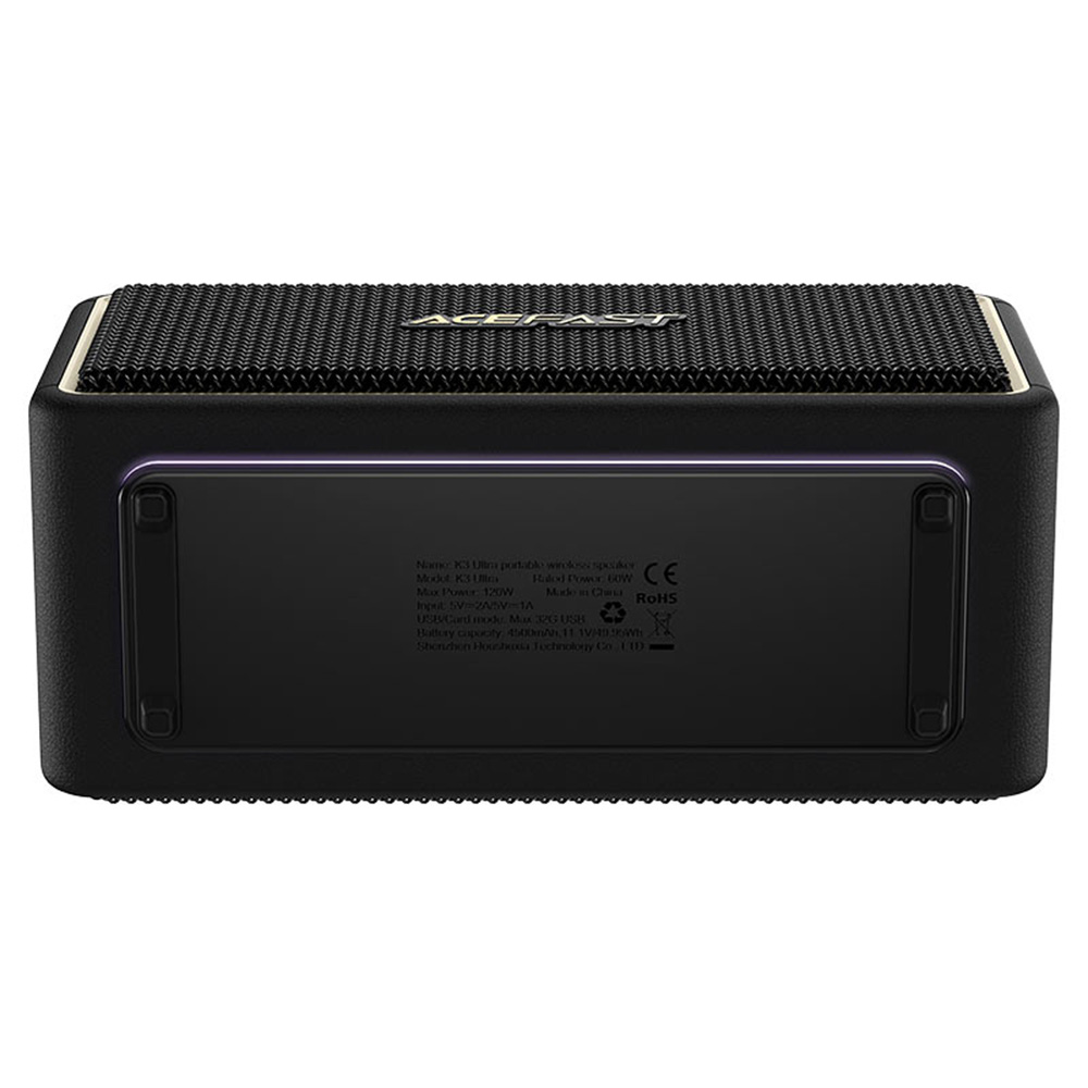 Reproduktor Acefast K3 Ultra se pyšní moderním a minimalistickým designem, který skvěle zapadne do každého interiéru. Jeho robustní černé tělo s elegantně zaoblenými rohy působí velmi sofistikovaně. Přední stranu zdobí jemná kovová mřížka, která chrání reproduktorové měniče a zároveň dodává zařízení prémiový vzhled. Decentní zlatavý rámeček kolem mřížky a logo ACEFAST uprostřed podtrhují jeho exkluzivitu. Spodní část reproduktoru je opatřena diskrétním LED osvětlením, které vytváří příjemnou atmosféru a dodává reproduktoru dynamický nádech.