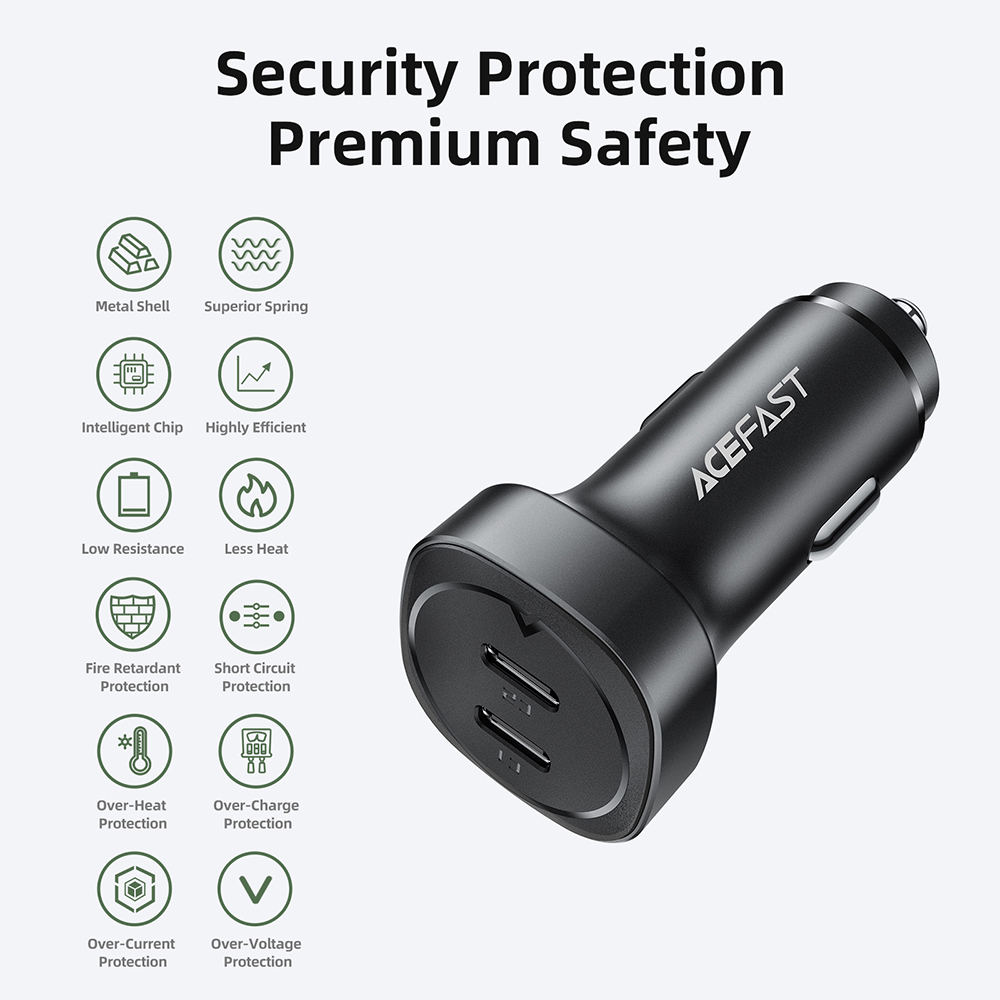 Nabíječka Acefast Car Charger B2 se pyšní minimalistickým a moderním designem v elegantní černé barvě. Její kompaktní rozměry zajišťují, že se perfektně hodí do interiéru každého vozu, aniž by rušila celkový vzhled palubní desky. Robustní konstrukce z kvalitních materiálů zaručuje dlouhou životnost a odolnost proti každodennímu opotřebení. Dva strategicky umístěné porty USB-C jsou snadno přístupné a diskrétní LED indikátor signalizuje stav nabíjení.