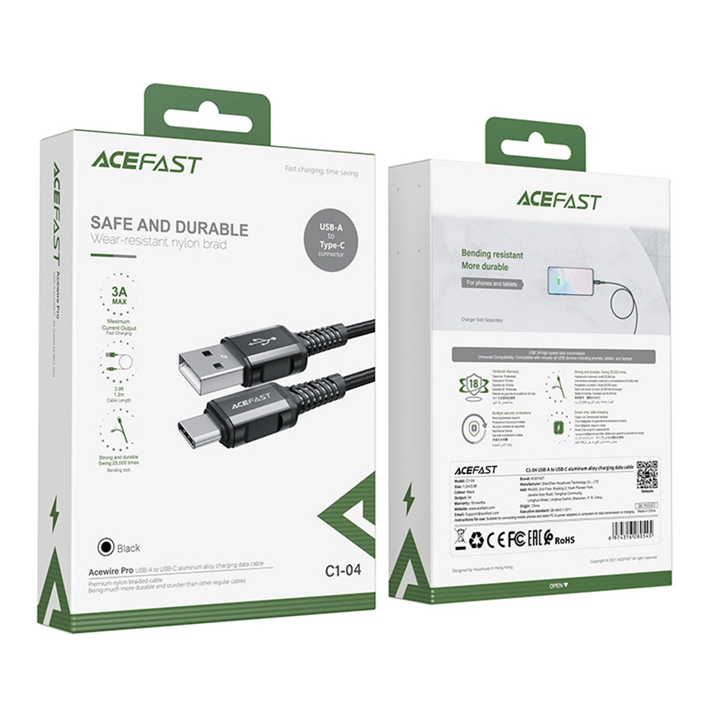 Kabel Acefast C1-04 se pyšní moderním a funkčním designem. Jeho robustní konstrukce je patrná na první pohled – kabel je potažen kvalitním nylonovým opletením v černé barvě, které zajišťuje maximální odolnost proti zamotání a mechanickému poškození. Konektory USB-A a Type-C jsou vyrobeny z odolné slitiny kovu v kombinaci s pevným plastem, což zaručuje dlouhou životnost a spolehlivé připojení. Na konektoru Type-C je decentně umístěno logo značky Acefast, které podtrhuje prémiový vzhled. Zesílené koncovky kabelu s žebrovanou texturou efektivně chrání proti zlomení v nejvíce namáhaných místech.