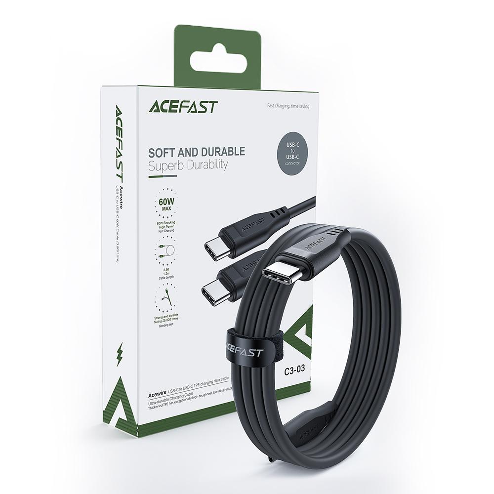 Acefast Data Cable C3-03 Type-C na Type-C 60W 3A 480Mb/s Rychlé nabíjení 1.2m černáS kabelem Acefast C3-03 získáte nejen funkční doplněk, ale i stylový prvek. Jeho **černé provedení** a **minimalistický design** se dokonale hodí k jakémukoli zařízení. Konektory jsou vyrobeny z **odolného kovu** a jejich pouzdra jsou opatřena **jemnou texturou**, která zajišťuje **pohodlné uchopení** a **zvýšenou odolnost** proti opotřebení. Kabel je navržen tak, aby byl **měkký a odolný**, což zaručuje jeho **dlouhou životnost** a **flexibilitu** při používání. Součástí balení je i praktický **organizér kabelu**, který usnadňuje jeho skladování a zabraňuje zamotání.