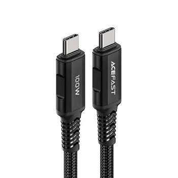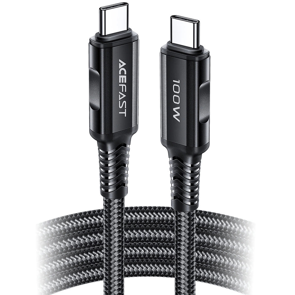 Kabel Acefast C4-03 se pyšní prémiovým zpracováním. Jeho design je promyšlený do posledního detailu, aby zajistil nejen estetický vzhled, ale především výjimečnou odolnost. Kabel je opatřen textilním opletením, které efektivně zabraňuje zamotávání a zvyšuje jeho mechanickou odolnost proti ohybu a opotřebení. Konektory jsou vyrobeny z robustního materiálu a disponují zesílenou ochranou proti zlomení v místech největšího namáhání, kde se kabel spojuje s koncovkou. Na jednom z konektorů je decentně vyraženo logo ACEFAST a na druhém indikace výkonu 100W, což podtrhuje jeho výkonnostní charakter. Celkový vzhled je minimalistický a moderní, dokonale se hodící k jakémukoli zařízení.