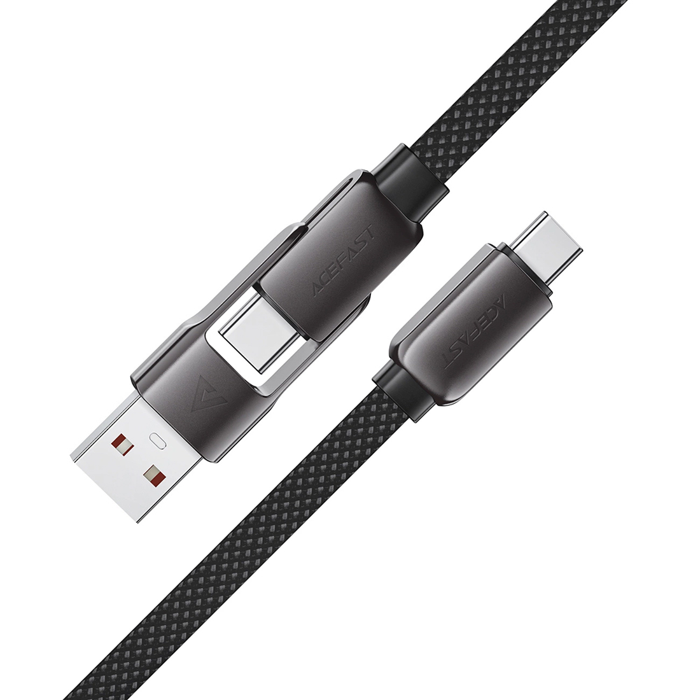Kabel Acefast C13-05 zaujme svým prémiovým designem a robustní konstrukcí. Je opatřen odolným opletením v černé barvě, které nejenže dodává kabelu sofistikovaný vzhled, ale především zabraňuje zamotávání a prodlužuje jeho životnost. Konektory jsou vyrobeny z kvalitních materiálů v tmavě šedé/černé barvě a nesou decentní logo značky Acefast, což podtrhuje jejich precizní zpracování. Unikátní je jeho chytré řešení konektorů: zatímco jeden konec je standardní USB Type-C, druhý konec je vybaven USB Type-A konektorem s integrovaným a snadno odnímatelným adaptérem na USB Type-C. Díky tomu se kabel stává mimořádně univerzálním a umožňuje připojení k široké škále zařízení.