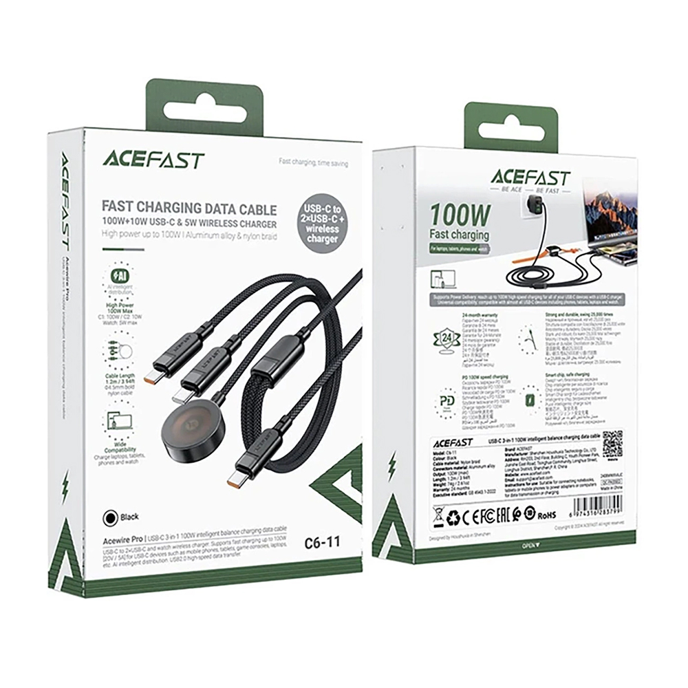 Kabel Acefast C6-11 se vyznačuje prémiovým a odolným designem v elegantní černé barvě. Je vyroben z hliníkové slitiny a nylonového opletu, což zaručuje jeho dlouhou životnost a odolnost proti zamotání a každodennímu opotřebení. S délkou 1.2 metru poskytuje dostatečnou volnost pohybu. Jeho promyšlená konstrukce integruje jeden vstupní konektor USB-C a tři výstupní možnosti: dva konektory USB-C a jednu bezdrátovou nabíjecí podložku pro chytré hodinky. Všechny konektory jsou robustní a spolehlivé, s jasně vyznačenými výkony pro optimální použití.