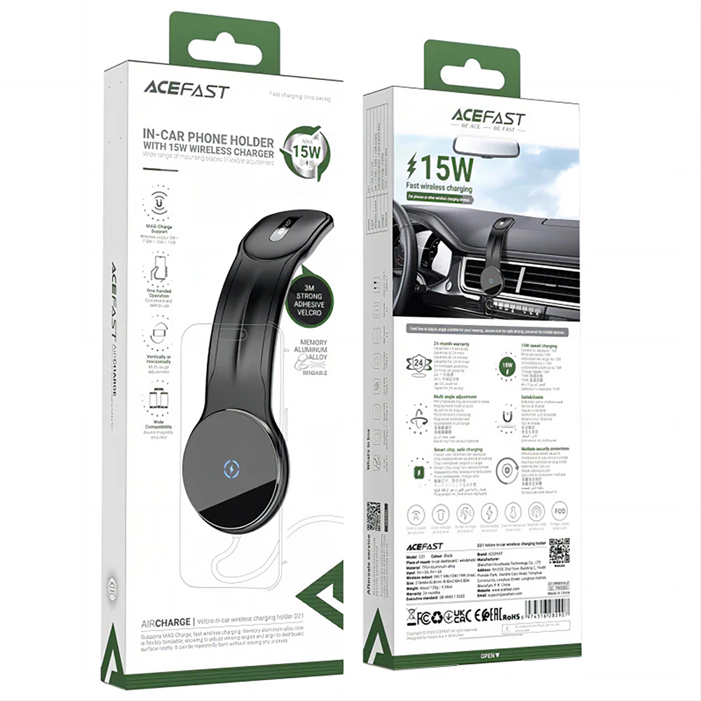 Acefast D21 se pyšní minimalistickým a zároveň futuristickým designem v elegantní černé barvě. Jeho tělo tvoří plynule zakřivená, štíhlá linie, která se harmonicky začlení do interiéru každého moderního vozu. Povrch držáku je matný, což mu dodává prémiový vzhled a příjemný pocit na dotek. Kruhová nabíjecí plocha s decentním symbolem blesku podtrhuje jeho technologickou vyspělost a funkčnost. Celkový dojem je čistý, sofistikovaný a vysoce praktický.