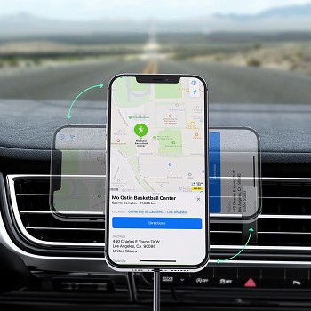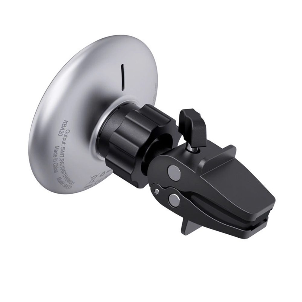 Držák Acefast D3 se pyšní minimalistickým a prémiovým designem, který skvěle doplní interiér každého moderního vozu. Nabíjecí podložka má elegantní kruhový tvar s lesklým černým povrchem, na kterém je decentně umístěno logo značky ACEFAST. Celou podložku obepíná výrazný stříbrný prstenec, který je nejen estetickým prvkem, ale také integruje jemné modré LED podsvícení signalizující stav nabíjení. Zadní strana podložky je rovněž ve stříbrném provedení, což podtrhuje celkový luxusní vzhled. Upevňovací mechanismus je tvořen robustním černým klipem určeným pro ventilační mřížku, který zajišťuje pevné a stabilní uchycení. Díky kulovému kloubu je možné držák otáčet o 360 stupňů, což vám umožní nastavit si telefon do ideální polohy pro navigaci nebo hands-free hovory, ať už na výšku, nebo na šířku.