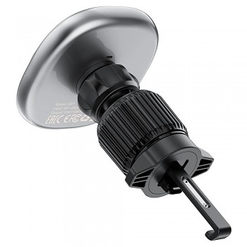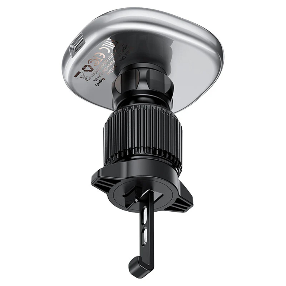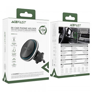 Držák Acefast D41 se pyšní moderním a minimalistickým designem. Jeho dominantou je kruhová nabíjecí plocha v elegantní tmavě šedé barvě s jemným soustředným vzorem a výrazným logem ACEFAST uprostřed. Celou nabíjecí plochu obepíná lesklý stříbrný prstenec, který dodává produktu prémiový vzhled. Robustní upevňovací mechanismus je navržen pro bezpečnou instalaci do ventilační mřížky a disponuje žebrovaným otočným kloubem pro snadné nastavení úhlu. Díky kompaktním rozměrům a promyšlené konstrukci držák nenarušuje výhled a je diskrétním, avšak výkonným doplňkem vašeho vozu.