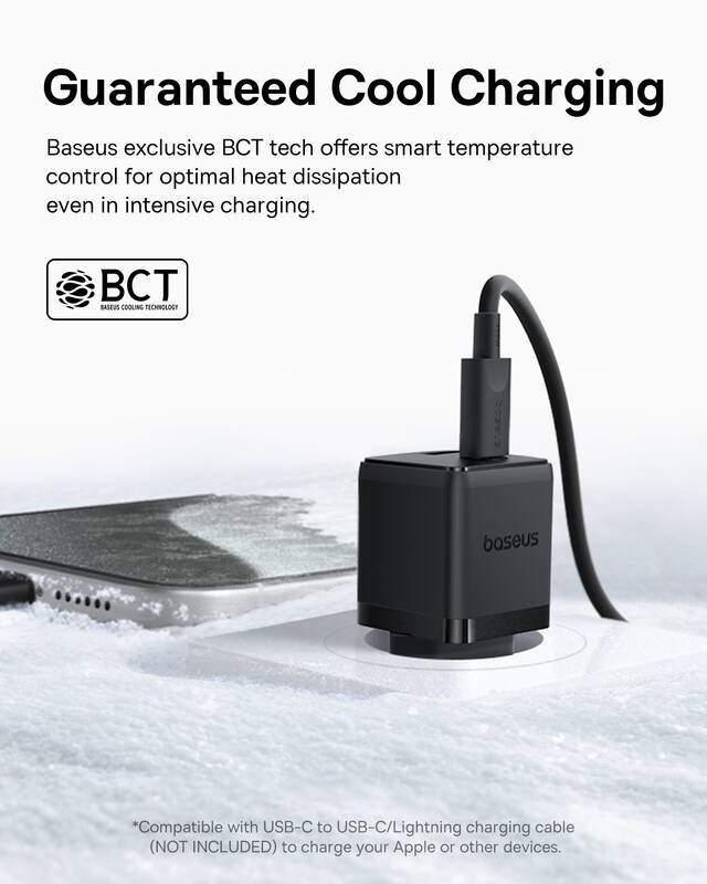 Nabíječka se pyšní minimalistickým a elegantním designem v bílém provedení. Její tělo má kompaktní obdélníkový tvar s jemně zaoblenými hranami, což zajišťuje pohodlné držení a snadnou manipulaci. Povrch je vyroben z kvalitního a odolného plastu s matnou úpravou, která odolává otiskům prstů. Na čelní straně jsou přehledně umístěny dva výstupní porty – moderní USB-C a klasický USB-A. Decentní logo Baseus na boční straně podtrhuje čistý a funkční vzhled produktu.