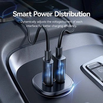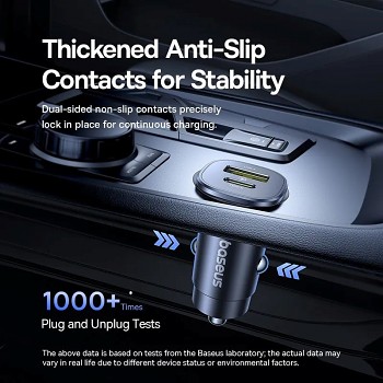 Nabíječka Baseus GoTrip se pyšní minimalistickým a elegantním designem, který dokonale zapadne do interiéru každého vozidla. Její tělo je vyrobeno z odolné kombinace materiálů ABS a PC v tmavě šedém provedení. Díky svým kompaktním rozměrům po zasunutí do zapalovače téměř nevyčnívá, což působí velmi čistě a neruší. Čelní panel s porty je lemován decentním světelným kroužkem, který usnadňuje připojení kabelů ve tmě. Unikátním designovým prvkem je malá výklopná rukojeť, která je v zasunutém stavu zcela skrytá a umožňuje mimořádně snadné a pohodlné vyjmutí nabíječky ze zásuvky.