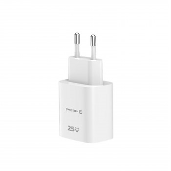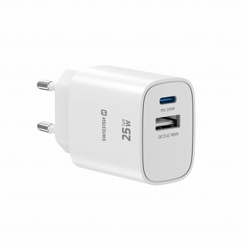 Adaptér Swissten Edge Gan 1x USB-C PD 25W + 1x USB-A 18W QC bílýVýkonná a kompaktní síťová nabíječka pro moderní elektroniku. Díky technologii GaN nabízí perfektní odvod tepla a bleskové nabíjení dvou zařízení naráz.