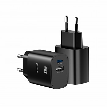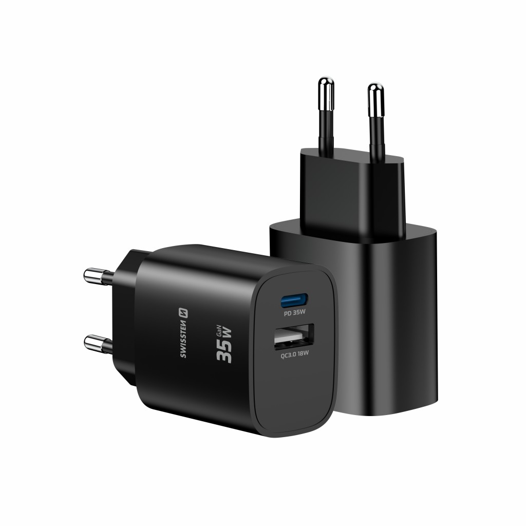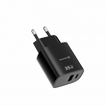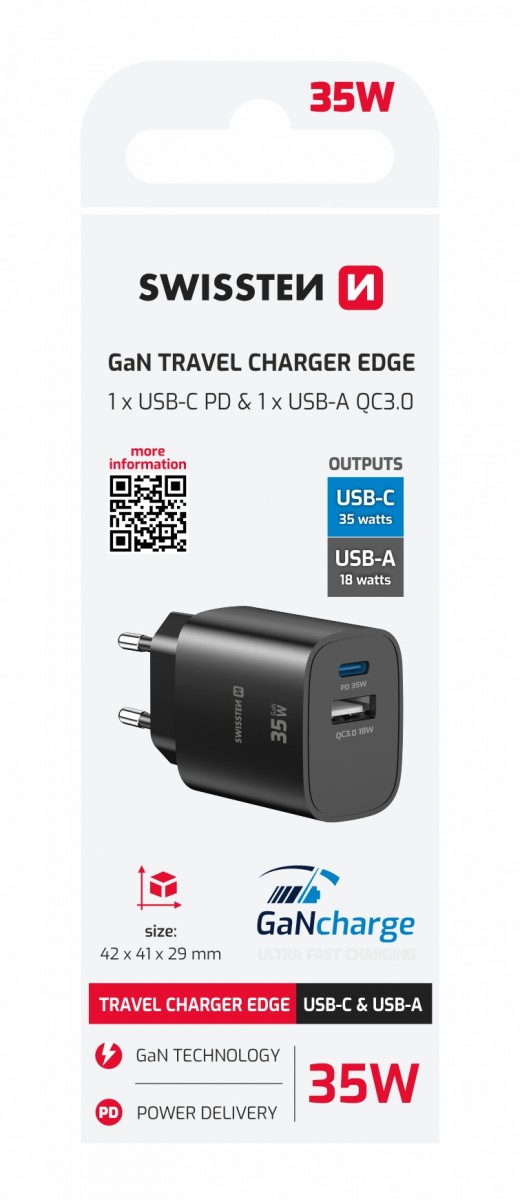 Adaptér Swissten Edge Gan 1x USB-C PD 35W + 1x USB-A 18W QC černýVelmi výkonná síťová nabíječka ideální pro náročnější elektroniku. Kompaktní tělo a technologie GaN zaručují bezpečné a bleskurychlé napájení bez přehřívání.