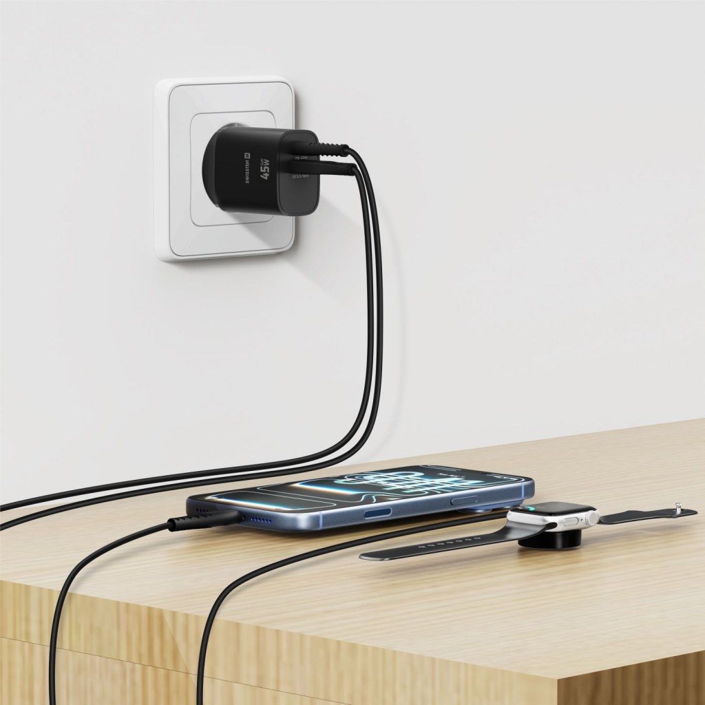 Adaptér Swissten Edge Gan 1x USB-C PD 45W + 1x USB-A 18W QC černýMimořádně výkonný síťový adaptér konstruovaný i pro napájení lehkých notebooků. Pokročilá technologie GaN dovoluje vysoký výkon bez robustních rozměrů.