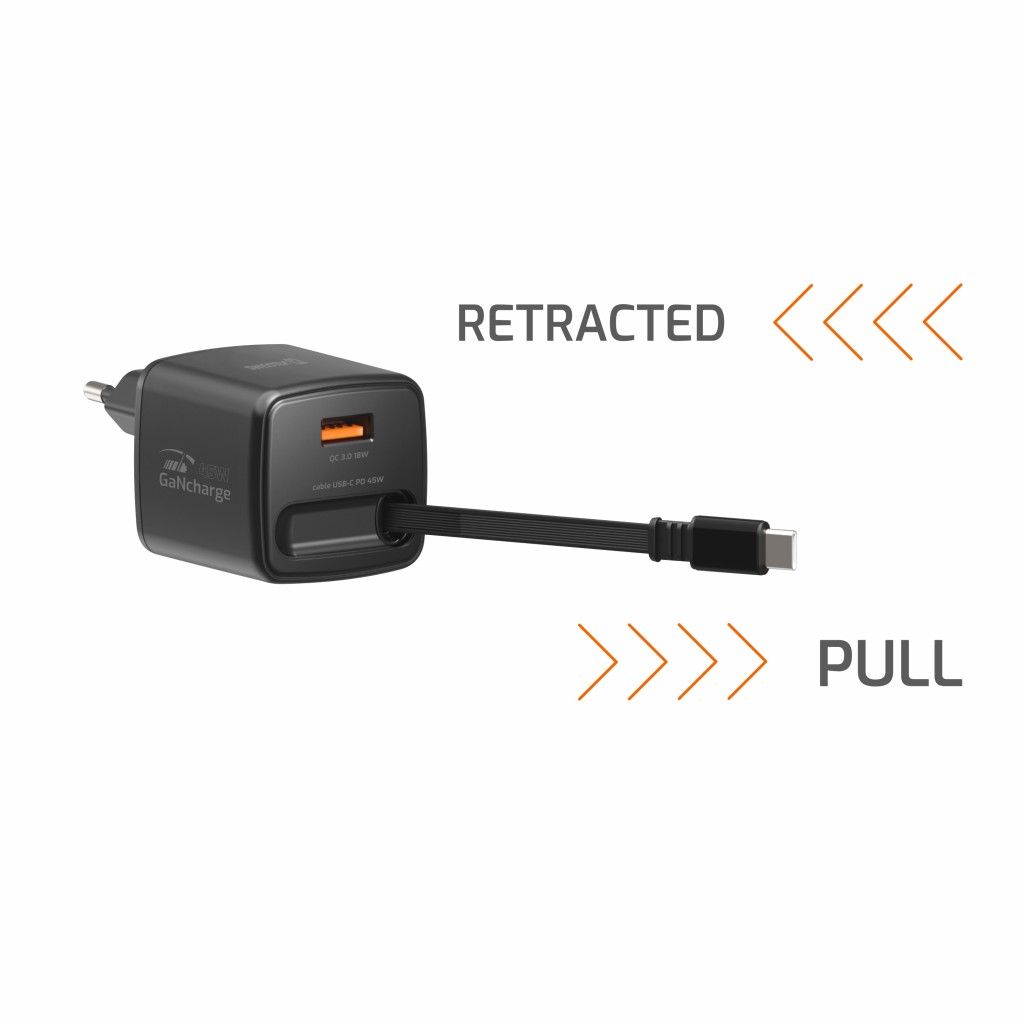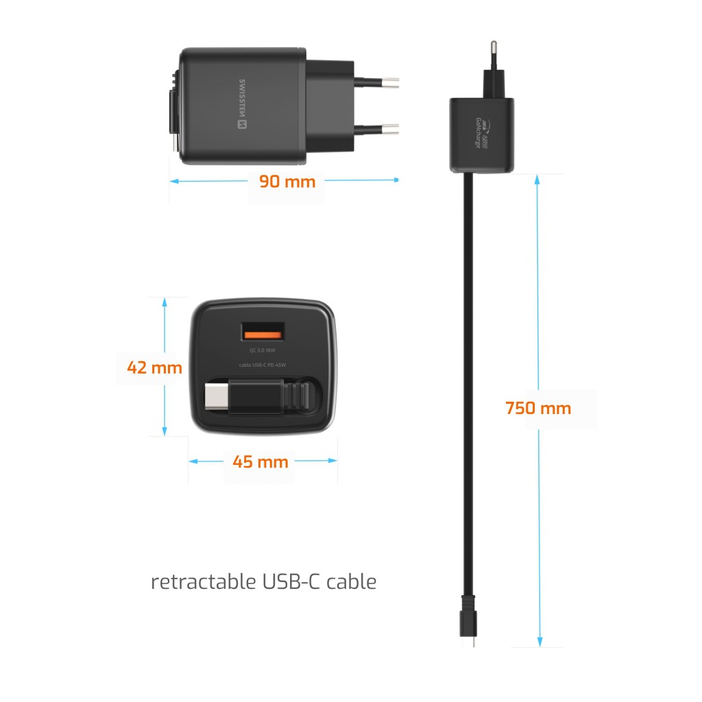 Adaptér Swissten Slidecharge Gan 45W, 1x USB-A 18W se zatahovacím usb-c kabelem 0.75 m černýExtra silný napájecí adaptér kombinující GaN technologie a unikátní zasunovací přívod. Vyhoví i majitelům notebooků vyžadujících příkon až 45W, aniž by museli nosit samostatný kabel.