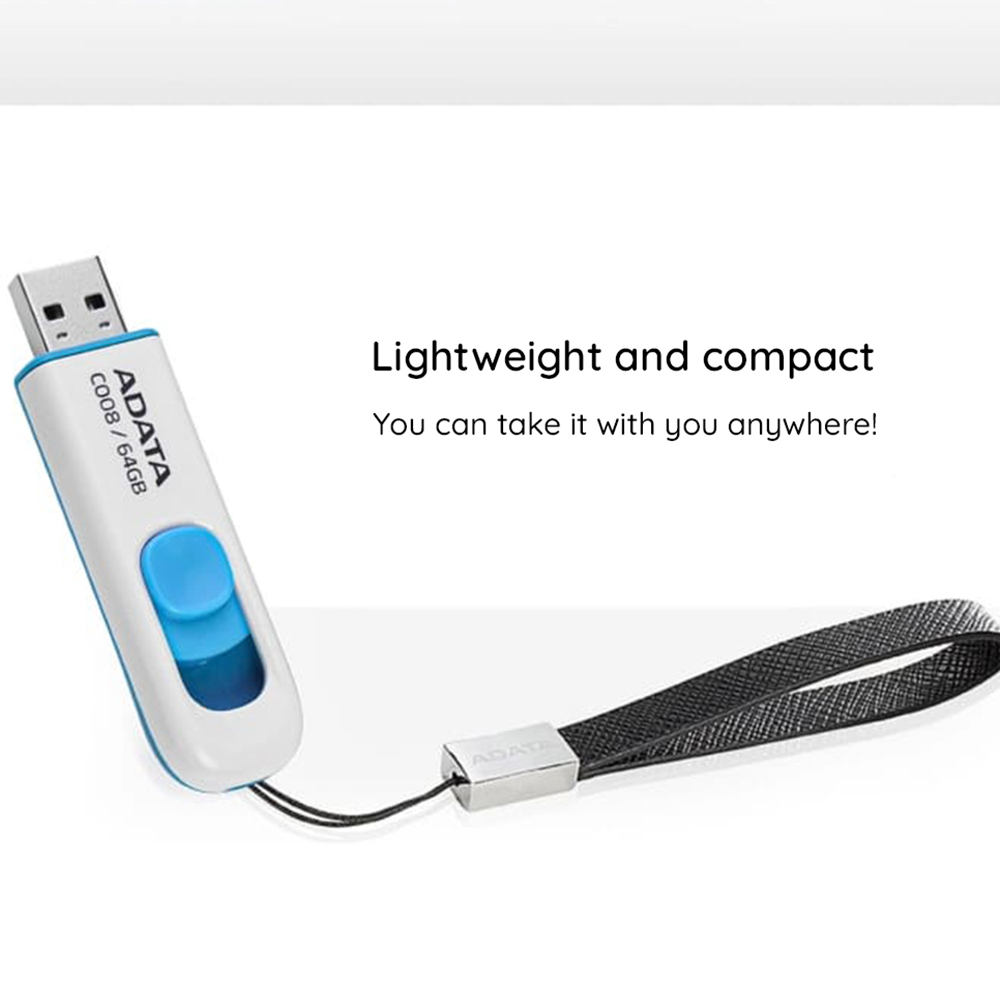 Flash disk Adata C008 se pyšní kompaktním a minimalistickým designem v matně černé barvě, která mu dodává sofistikovaný vzhled. Jeho chytré provedení s výsuvným USB konektorem eliminuje potřebu krytky, což nejen zvyšuje pohodlí při používání, ale také chrání konektor před poškozením a ztrátou. Díky integrovanému otvoru na poutko jej můžete snadno připevnit ke klíčům nebo batohu a mít svá data vždy po ruce.