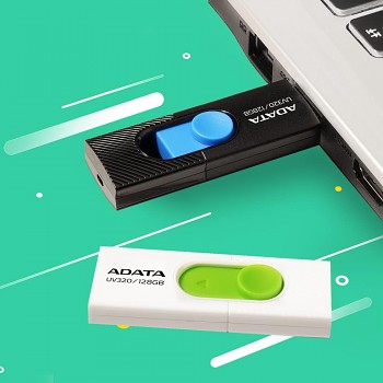 Flashdisk Adata se pyšní praktickým a stylovým designem. Tělo je vyvedeno v matné černé barvě s jemnou texturou, která zajišťuje příjemný úchop a odolnost proti otiskům prstů. Dominantním prvkem je výsuvný konektor USB v zářivě modré barvě, který se ovládá pomocí posuvného mechanismu s kruhovým tlačítkem. Tento mechanismus chrání konektor před poškozením a zároveň eliminuje potřebu krytky, kterou byste mohli snadno ztratit. Na těle flashdisku je zřetelně viditelné logo značky ADATA, označení modelu UV320/64GB a specifikace rozhraní USB 3.1, což podtrhuje jeho moderní a výkonné parametry.