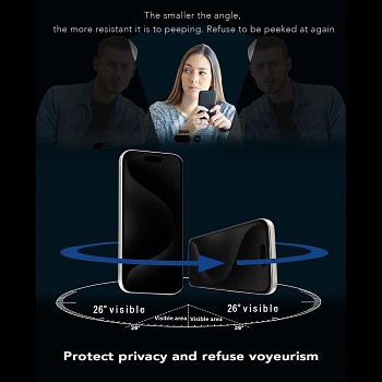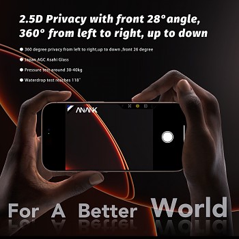 Ochranný filtr ANANK se pyšní 2.5D zaoblenými hranami, které dokonale splynou s designem vašeho telefonu a zajistí příjemný pocit při používání. Jeho černá barva elegantně doplňuje vzhled zařízení. Klíčovou vlastností je 360° ochrana soukromí, která efektivně zabraňuje nežádoucím pohledům z jakéhokoli úhlu – ať už zleva, zprava, shora nebo zdola. Displej je viditelný pouze z přímého pohledu v úhlu 26 stupňů, což znamená, že obsah vašeho telefonu zůstane diskrétní a soukromý.