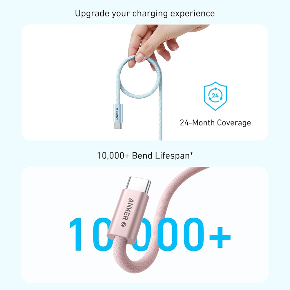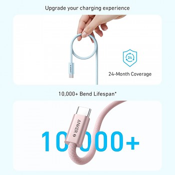Kabel Anker Zolo A8060H21 se pyšní minimalistickým a sofistikovaným designem v čistě bílé barvě. Jeho povrch je tvořen odolným opletením, které nejenže dodává kabelu prémiový vzhled, ale zároveň výrazně zvyšuje jeho životnost a odolnost proti zamotání a opotřebení. Robustní stříbrné konektory Type-C jsou precizně zpracované a nesou elegantní logo Anker, což podtrhuje celkovou kvalitu produktu. Tento design zaručuje, že kabel bude nejen funkční, ale i estetickým doplňkem k vašim zařízením.