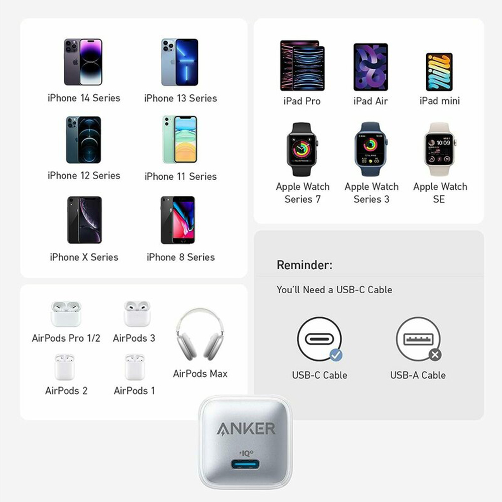 Produkt je určen pro modely telefonů s podporou rychlého nabíjení přes USB-C, jako jsou například iPhone 8 a novější (včetně řad iPhone 12, 13, 14, 15), Samsung Galaxy S20 a novější, Google Pixel a další kompatibilní zařízení.