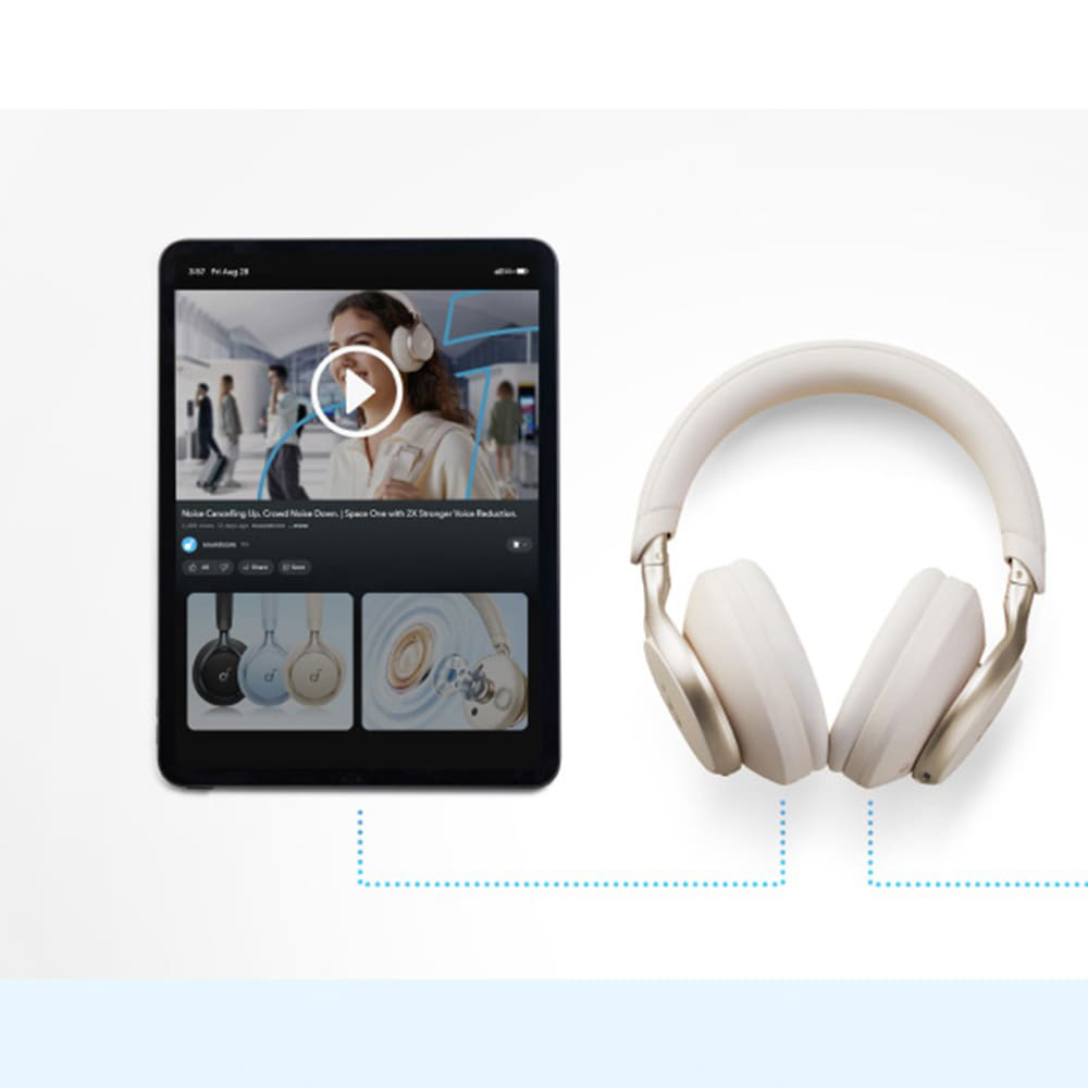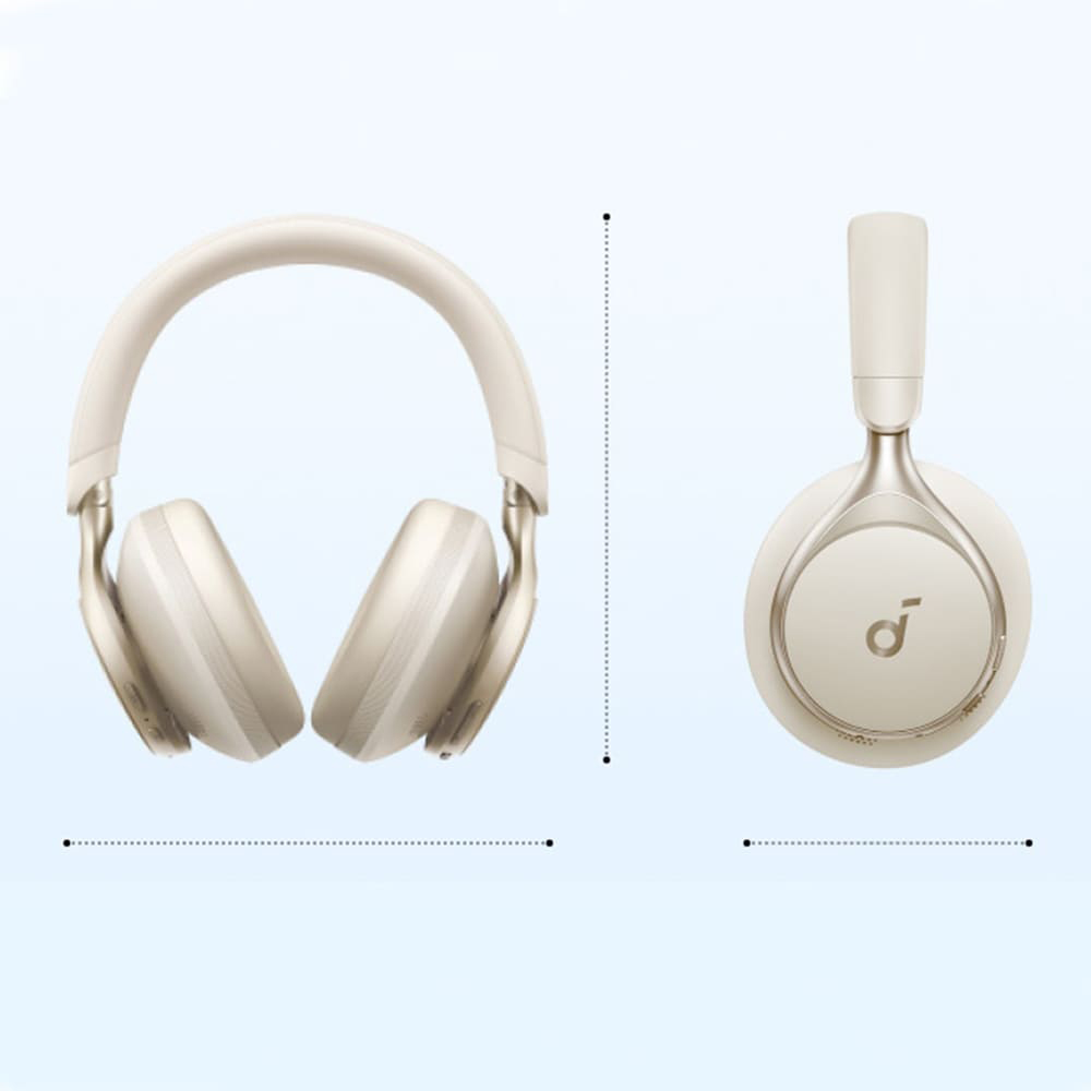 Sluchátka Anker SoundCore Space One se pyšní minimalistickým a sofistikovaným designem v jemné bílé barvě s decentními zlatavými nebo stříbrnými akcenty na kloubech a vnějších stranách náušníků. Jejich náušníky přes uši jsou navrženy pro maximální pohodlí i při dlouhodobém nošení, s měkkým polstrováním, které dokonale obepne vaše uši. Lehká a skládací konstrukce zajišťuje snadnou přenositelnost, takže si je můžete vzít kamkoli s sebou. Ovládací prvky jsou intuitivně umístěny na náušnících pro snadný přístup k hlasitosti, přehrávání a správě hovorů.