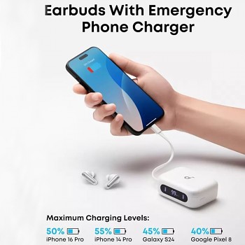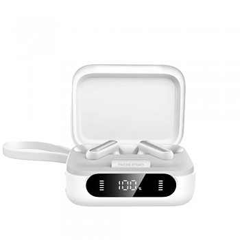 Kompaktní **nabíjecí pouzdro** s oblými hranami je stejně praktické jako stylové. Na přední straně je vybaveno **přehledným LED displejem**, který **zobrazuje stav baterie**. Integrované **silikonové poutko** na boku pouzdra usnadňuje přenášení a zajišťuje, že budete mít sluchátka vždy po ruce. Navíc pouzdro disponuje **integrovaným stojánkem na telefon**, což z něj činí **multifunkčního společníka** pro každodenní použití.
