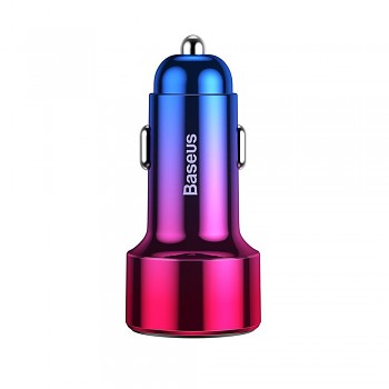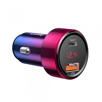 Nabíječka Baseus Magic Series zaujme na první pohled svým unikátním designem s "Aurora Color" efektem. Její tělo se pyšní gradientním přechodem barev od sytě modré v horní části až po zářivou růžovo-purpurovou ve spodní části, což jí dodává futuristický a luxusní vzhled. Kompaktní rozměry a precizní zpracování z kvalitních materiálů zajišťují, že se nabíječka dokonale hodí do interiéru každého vozu. Na čelní straně naleznete integrovaný LED displej, který v reálném čase zobrazuje aktuální napětí, což vám poskytuje neustálý přehled o stavu nabíjení.