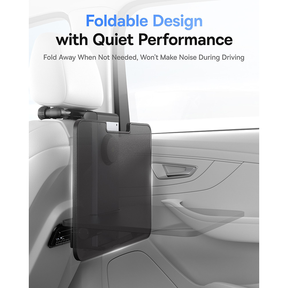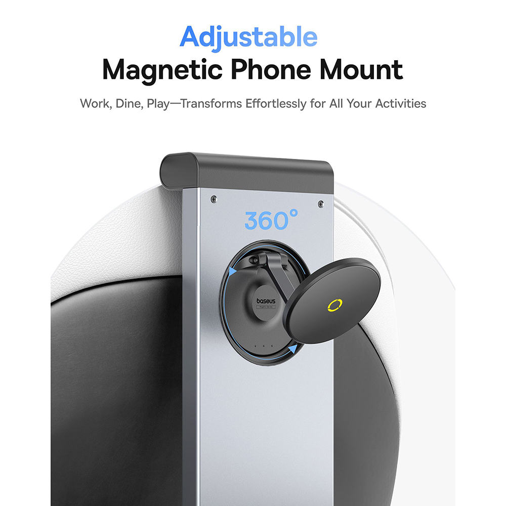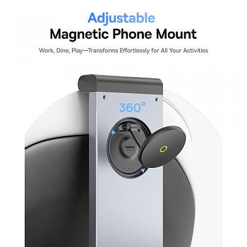 Součástí držáku je integrovaný magnetický držák telefonu s možností otáčení o 360°, což zaručuje optimální pozorovací úhel pro sledování filmů, hraní her nebo videohovory. Díky silným magnetům je váš telefon pevně a bezpečně uchycen. Další praktickou součástí je výklopný stolek, který poskytuje stabilní plochu pro práci, jídlo nebo zábavu. Stolek je navržen tak, aby unesl zátěž až 20 kg, což svědčí o jeho robustnosti a odolnosti. Nechybí ani integrovaný držák na nápoje, který lze snadno vyklopit a zase skrýt, když není potřeba, a zajistí tak bezpečné uložení vašeho pití.