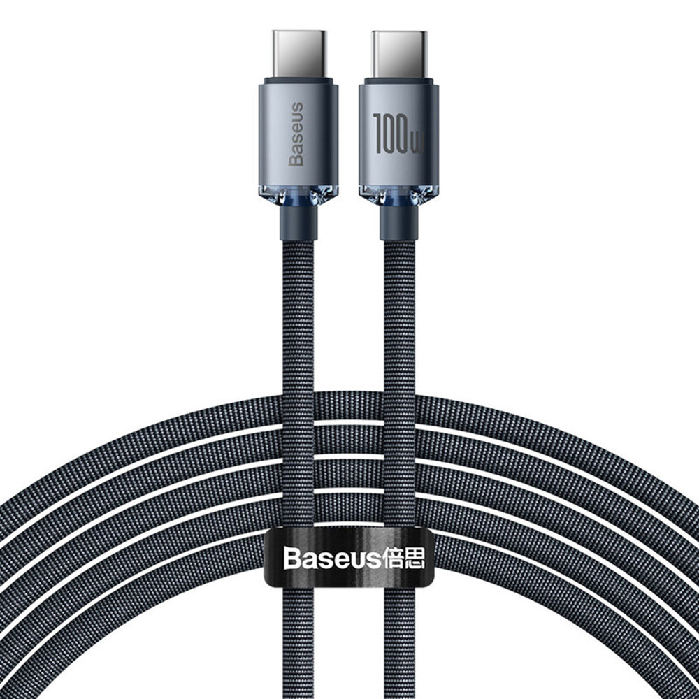 Design kabelu Baseus Crystal Shine je skutečně promyšlený. Kabel je vyveden v černém nylonovém opletení, které mu dodává nejen robustnost, ale i sofistikovaný vzhled. Kovové koncovky konektorů v elegantní šedé barvě jsou precizně zpracované a zajišťují stabilní připojení. Co však kabel odlišuje, je průsvitný, krystalický prvek u základny každého konektoru, který podtrhuje název "Crystal Shine" a dodává produktu moderní a luxusní nádech. Na jedné koncovce je decentně vyraženo logo Baseus a na druhé pak údaj o výkonu 100W, což zdůrazňuje jeho schopnosti.