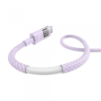 Kabel Baseus Data Cable Display 2 zaujme na první pohled svým moderním a funkčním designem. Je vyveden v elegantní fialové barvě, která dodává produktu sofistikovaný vzhled. Kabel je opatřen odolným textilním opletením, které nejenže zvyšuje jeho životnost a odolnost proti opotřebení, ale také efektivně zabraňuje zamotání. Nejvýraznějším prvkem je však integrovaný digitální displej umístěný na konektoru Type-C, který v reálném čase zobrazuje aktuální nabíjecí výkon. Koncovky jsou robustní a precizně zpracované, s logem Baseus na USB konektoru, což podtrhuje kvalitu a pozornost k detailům.