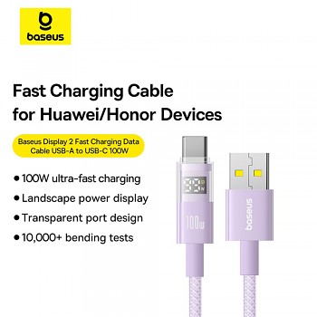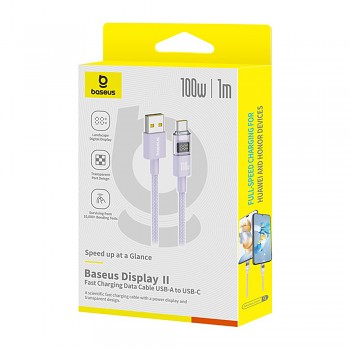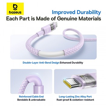 Kabel Baseus Data Cable Display 2 se pyšní nejen špičkovou funkčností, ale i promyšleným designem. Jeho pastelově fialová barva, připomínající mlhovinu, je elegantní a moderní. Opletený povrch kabelu nejen skvěle vypadá, ale také zvyšuje jeho odolnost proti mechanickému poškození. Nejvýraznějším prvkem je bezesporu průhledný Type-C konektor s digitálním displejem, který je nejen praktický, ale i futuristický. Zesílené a ergonomicky tvarované koncovky kabelu v ladící fialové barvě zajišťují pohodlné a bezpečné připojení.