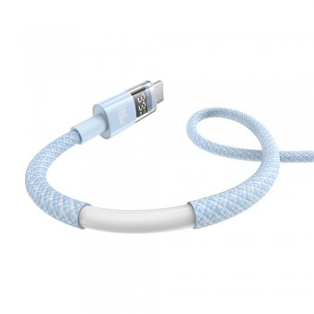 Kabel se pyšní elegantním provedením v barvě Galaxy modrá, která mu dodává svěží a moderní vzhled. Jeho tělo je tvořeno odolným opleteným materiálem v kombinaci světle modrých a bílých vláken, což zaručuje dlouhou životnost a odolnost proti zamotání. Klíčovým prvkem designu je průhledné pouzdro na konektoru Type-C, které ukrývá digitální displej. Ten v reálném čase zobrazuje aktuální nabíjecí výkon ve wattech, což vám poskytuje dokonalý přehled o procesu nabíjení. Oba konektory, USB-A i Type-C, jsou vyvedeny ve stejném světle modrém odstínu a jsou vyrobeny z kvalitní slitiny zinku, která je odolná proti korozi a oxidaci. Zesílené konce kabelu navíc zajišťují zvýšenou odolnost proti ohybu a zlomení, což prodlužuje jeho životnost i při intenzivním používání.