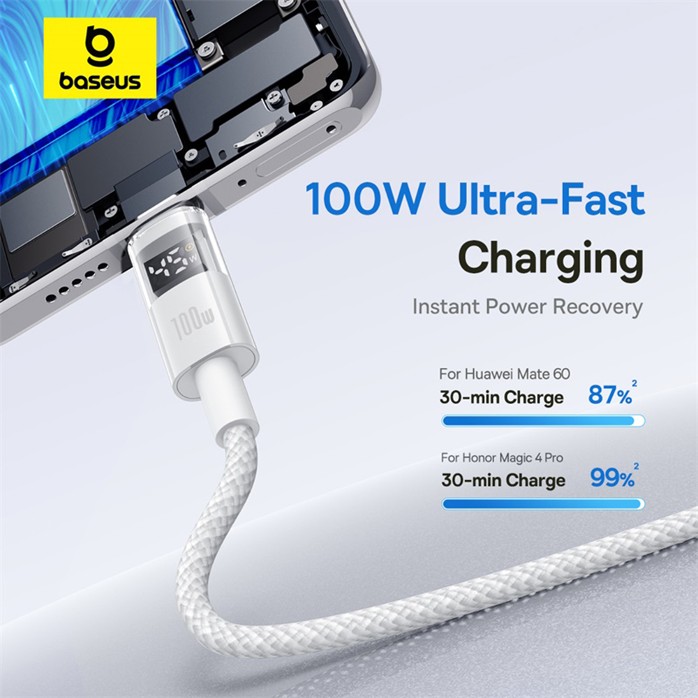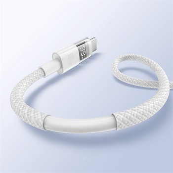 Kabel Baseus Data Cable Display 2 v provedení Měsíční Bílá zaujme na první pohled svým čistým a minimalistickým vzhledem. Jeho tělo je tvořeno odolným opleteným materiálem, který zajišťuje vysokou flexibilitu a zároveň chrání kabel před zamotáním a poškozením při každodenním používání. Konektory USB a Type-C jsou robustní a precizně zpracované, což zaručuje dlouhou životnost a stabilní připojení. Nejvýraznějším prvkem je však integrovaný digitální displej na konektoru Type-C, který v reálném čase zobrazuje aktuální nabíjecí výkon ve wattech. Tento průhledný prvek s jasným zobrazením dodává kabelu futuristický a vysoce funkční charakter.