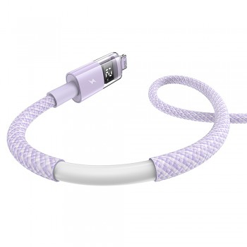 Kabel Baseus Display 2 se pyšní nejen svými funkcemi, ale také promyšleným designem. Je vyveden v jemné fialové barvě a jeho tělo je tvořeno odolným pleteným materiálem, který zabraňuje zamotávání a zvyšuje celkovou životnost kabelu. Konektory jsou vyrobeny z kvalitních materiálů a jsou rovněž v elegantním fialovém odstínu, s decentně umístěným logem Baseus na USB konektoru. Nejvýraznějším prvkem je průhledný digitální displej na Lightning konektoru, který dodává kabelu futuristický a praktický rozměr.