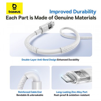 Kabel Baseus Data Cable Display 2 se pyšní minimalistickým a funkčním designem. V elegantní měsíční bílé barvě působí čistě a moderně. Je vyroben z prémiových materiálů, které zajišťují vysokou odolnost proti opotřebení a zamotání. Zesílené konektory z hliníkové slitiny zaručují dlouhou životnost a spolehlivé připojení. Nejvýraznějším prvkem je integrovaný digitální displej přímo na konektoru, který v reálném čase zobrazuje aktuální nabíjecí proud, což vám dává plnou kontrolu nad procesem nabíjení.