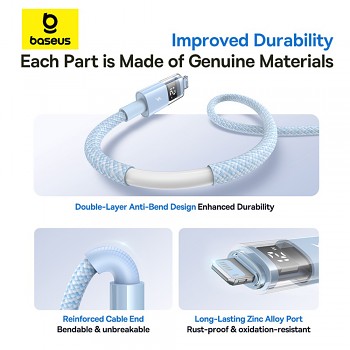 Kabel Baseus Display 2 zaujme na první pohled svým moderním a promyšleným designem. Je vyveden v příjemné modré barvě s jemným, ale odolným opleteným textilním povrchem, který zabraňuje zamotávání a zvyšuje celkovou životnost kabelu. Klíčovým prvkem je průhledný konektor Lightning, který v sobě skrývá digitální displej. Ten v reálném čase zobrazuje aktuální nabíjecí výkon ve wattech (W), což vám umožní mít vždy přehled o rychlosti nabíjení vašeho zařízení. Konce kabelu jsou zesílené, aby odolaly opakovanému ohýbání a minimalizovaly riziko poškození, což potvrzují testy s více než 10 000 ohyby. Konektor je vyroben z odolné slitiny zinku, která je odolná proti korozi a oxidaci, což zaručuje dlouhodobou spolehlivost.