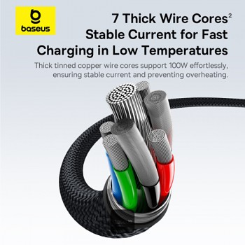 Kabel Baseus Flash Series 3 se pyšní prémiovým designem a vysokou odolností. Je vyveden v elegantní černé barvě a jeho povrch je tvořen odolným nylonovým opletením, které efektivně zabraňuje zamotávání a zvyšuje celkovou životnost kabelu. Koncovky jsou robustní a pevné, s jasně vyznačeným výkonem 100W na každém konektoru Type-C, což podtrhuje jeho schopnost rychlého nabíjení. Centrální rozbočovač s logem Baseus je kompaktní a esteticky zapadá do celkového vzhledu, zatímco praktický pásek se suchým zipem s logem Baseus usnadňuje organizaci kabelu.
