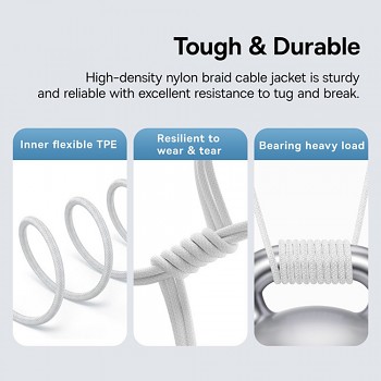 Kabel Baseus Gem se pyšní minimalistickým a sofistikovaným designem v barvě Měsíční bílá, která dodá vašemu pracovnímu prostoru nádech elegance. Jeho konstrukce je navržena s ohledem na maximální odolnost a dlouhou životnost. Kvalitní materiály a precizní zpracování zaručují, že kabel odolá každodennímu používání, ohýbání a opotřebení. Zesílené koncovky konektorů navíc efektivně předcházejí poškození v nejvíce namáhaných místech.