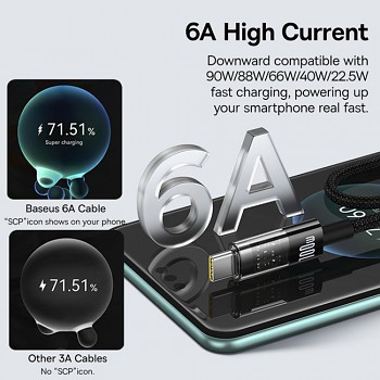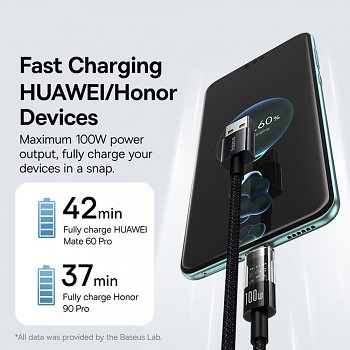 S podporou výkonu až 100W a vysokého proudu 6A umožňuje tento kabel bleskurychlé nabíjení kompatibilních zařízení. Je zpětně kompatibilní s protokoly rychlého nabíjení 90W, 88W, 66W, 40W a 22.5W, což zajišťuje širokou použitelnost. Díky funkci Smart Trickle Charging se kabel automaticky přepne na udržovací nabíjení, jakmile je baterie téměř plná, čímž chrání vaše zařízení před přebíjením a prodlužuje životnost baterie. Například, dokáže plně nabít Huawei Mate 60 Pro za pouhých 42 minut a Honor 90 Pro za 37 minut.