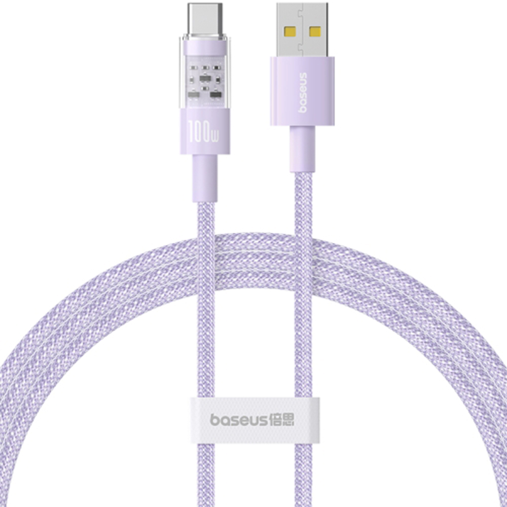 Design kabelu Baseus Gem je stejně působivý jako jeho výkon. Je vyveden v nádherné fialové barvě Nebula Purple, která dodává nádech originality a stylu. Kabel je opletený, což výrazně zvyšuje jeho odolnost proti zamotání, opotřebení a mechanickému poškození. Koncovka Type-C je opatřena průhledným krytem, který odhaluje vnitřní komponenty a elegantně zobrazuje označení "100W", což podtrhuje jeho vysoký výkon. Koncovka USB-A je pak v jednotné fialové barvě s decentním logem Baseus. Součástí balení je i praktický pásek na suchý zip pro snadné uspořádání kabelu.