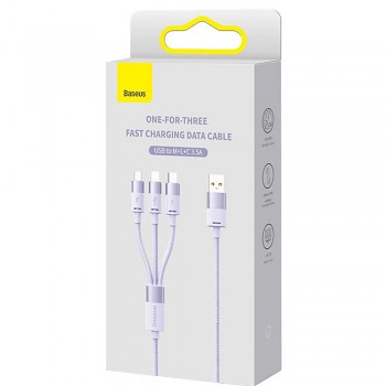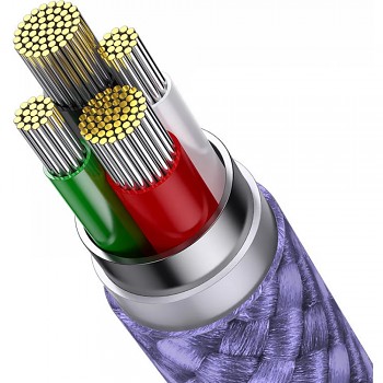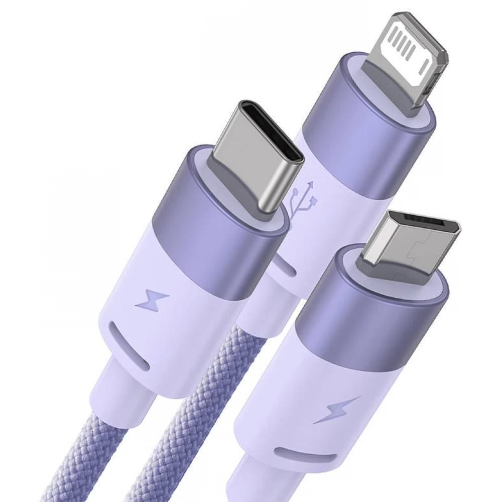 Kabel Baseus StarSpeed zaujme na první pohled svým moderním a odolným designem. Je vyveden v atraktivní fialové barvě a jeho povrch je tvořen pevným pleteným opletením, které výrazně zvyšuje jeho životnost a odolnost proti zamotání a mechanickému poškození. Koncovky konektorů jsou vyrobeny z kvalitního kovu v ladícím světle fialovém odstínu, což zajišťuje nejen estetický vzhled, ale i spolehlivé a stabilní připojení. Každý z výstupních konektorů je navíc označen symbolem blesku, signalizujícím podporu rychlého nabíjení. Kabel se elegantně rozděluje na tři samostatné větve, což umožňuje současné nabíjení různých typů zařízení.