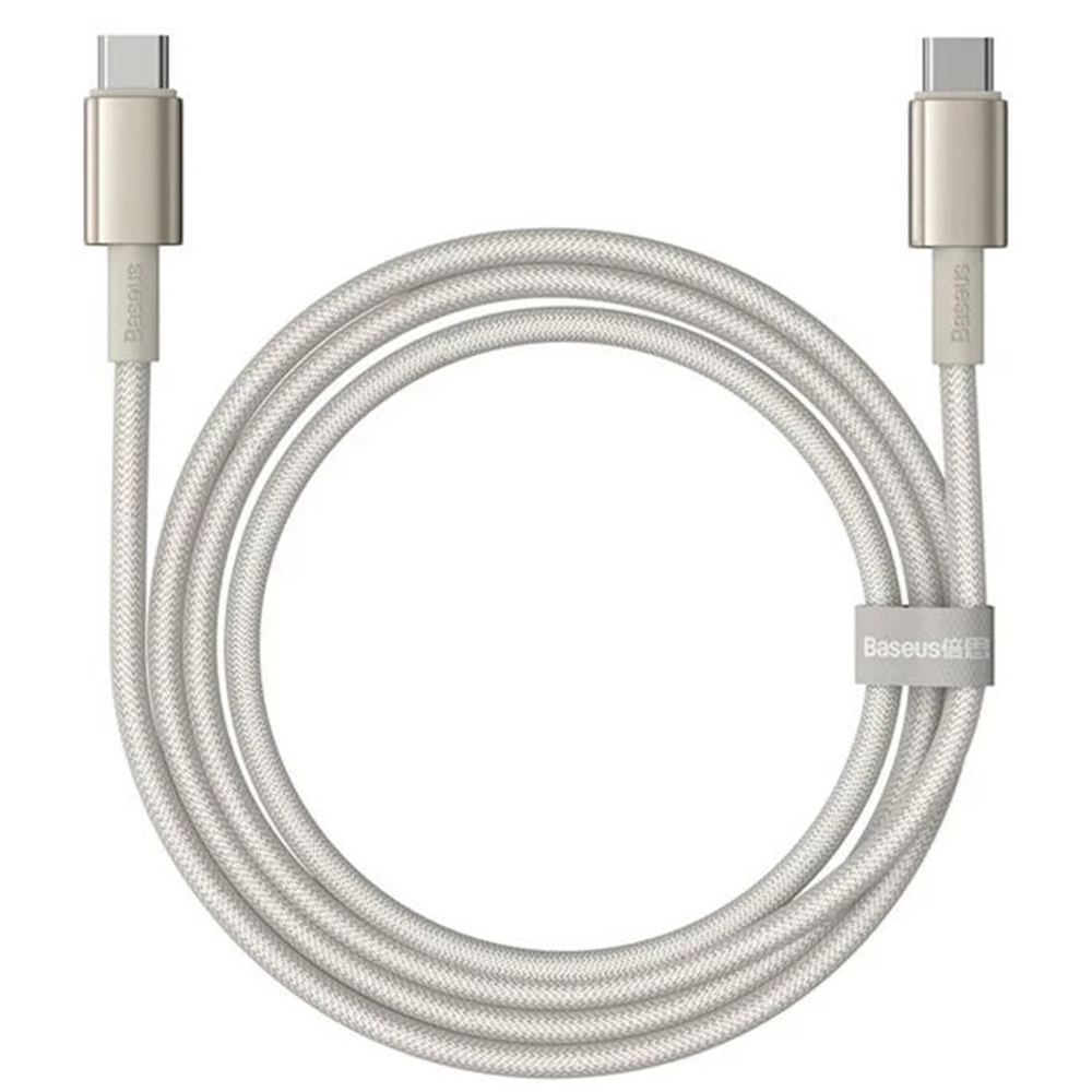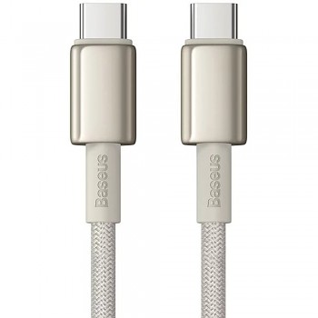 Kabel Baseus Tungsten Gold se pyšní prémiovým zpracováním a nadčasovým designem. Jeho tělo je tvořeno odolným opletením v elegantním světle zlatém odstínu, které nejenže skvěle vypadá, ale také zabraňuje zamotávání a prodlužuje životnost kabelu. Kovové koncovky konektorů v lesklé zlaté barvě dodávají kabelu luxusní vzhled a jsou navrženy pro maximální odolnost proti opotřebení. Jemné logo Baseus je decentně umístěno na objímce konektoru, což podtrhuje smysl pro detail. Vnitřní část konektorů Type-C je zvýrazněna červeným akcentem, což je nejen stylový prvek, ale také pomáhá s orientací.