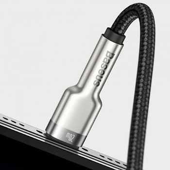 Design kabelu se vyznačuje černým opleteným pláštěm, který nejen skvěle vypadá, ale také efektivně zabraňuje zamotávání a zvyšuje odolnost proti mechanickému poškození. Konektory jsou vyrobeny z prémiového kovu ve stříbrném odstínu, což dodává kabelu luxusní vzhled a zároveň zajišťuje pevné a stabilní připojení. Na obou konektorech je decentně vyraženo logo značky Baseus a údaj "20W", což podtrhuje jeho schopnost rychlého nabíjení. Díky zesíleným spojům mezi kabelem a konektory je minimalizováno riziko zlomení, což prodlužuje celkovou životnost produktu.