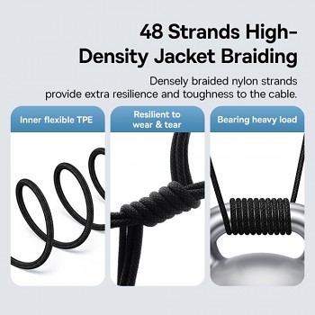 Kabel Baseus Gem zaujme na první pohled svým transparentním pouzdrem na konektoru Lightning, které odhaluje precizně zpracované vnitřní komponenty a jasně viditelné označení 20W. Tento jedinečný prvek nejen podtrhuje technologickou vyspělost, ale také dodává kabelu futuristický vzhled. Samotný kabel je opatřen vysoce odolným nylonovým opletením, tvořeným 48 prameny, které zajišťuje mimořádnou pružnost a odolnost proti opotřebení, roztržení a každodennímu namáhání. Vnitřní flexibilní vrstva z TPE materiálu pak přispívá k celkové životnosti a ohebnosti kabelu. Černá barva Cluster Black dodává kabelu univerzální a elegantní vzhled, který se hodí ke každému zařízení.