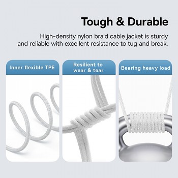 Design kabelu Baseus Gem je skutečně unikátní. Konektor Type-C je opatřen průhledným pouzdrem, které odhaluje vnitřní čip a komponenty, čímž dodává kabelu futuristický a technologický vzhled. Nejde však jen o estetiku; samotný kabel je chráněn opletením z nylonu s vysokou hustotou, což zajišťuje jeho mimořádnou odolnost proti opotřebení, tahání a zlomení. Díky tomu se můžete spolehnout na dlouhou životnost a spolehlivost i při každodenním intenzivním používání.