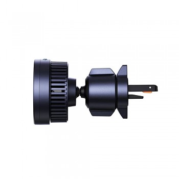 Držák Baseus MagPro v provedení Cosmic Black se vyznačuje minimalistickým a zároveň futuristickým designem. Hlavní nabíjecí plocha je kruhová, s lesklým povrchem a decentním logem Qi uprostřed, což dodává produktu prémiový vzhled. Okraje nabíjecí plochy jsou opatřeny jemnými lamelami, které naznačují efektivní odvod tepla a přispívají k celkovému modernímu dojmu. Upevňovací mechanismus do ventilace je robustní, s otočným kloubem pro maximální flexibilitu a snadné nastavení. Celkové zpracování je precizní, s důrazem na kvalitní materiály a dlouhou životnost.