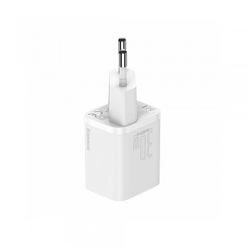 Nabíječka Baseus CCSUP-J02 se pyšní čistým a minimalistickým designem v matně bílé barvě, který se snadno začlení do každého interiéru. Její kompaktní rozměry a nízká hmotnost zajišťují maximální přenosnost, takže ji můžete mít vždy po ruce, ať už doma, v kanceláři nebo na cestách. Na boku adaptéru je decentně vyveden nápis "30W – SUPER SI –", který zdůrazňuje klíčové vlastnosti a technologii produktu. Integrovaná jedna USB-C zdířka je umístěna na horní straně, což zajišťuje snadné připojení kabelu. Standardní evropská zástrčka pak garantuje širokou kompatibilitu s elektrickými sítěmi.