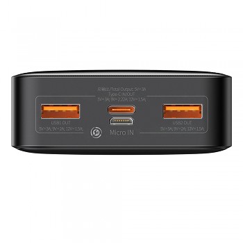 Powerbanka Baseus Bipow zaujme svým moderním a minimalistickým designem. Její kompaktní obdélníkový tvar a elegantní černé provedení s jemnou texturou na povrchu působí velmi sofistikovaně. Dominantním prvkem je integrovaný digitální displej, který přehledně zobrazuje aktuální stav nabití baterie v procentech, takže vždy víte, kolik energie vám zbývá. Na jedné straně powerbanky naleznete logo značky Baseus, které podtrhuje její prémiový původ. Pro maximální flexibilitu je vybavena dvěma výstupními porty USB-A, jedním vstupním/výstupním portem USB-C a jedním vstupním portem Micro-USB, což umožňuje nabíjet více zařízení současně a s různými typy kabelů.