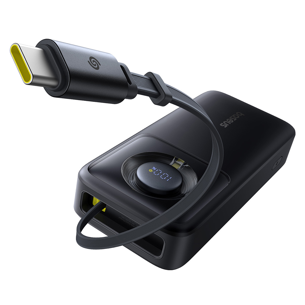 Design power banky Baseus Free2Pull je synonymem pro minimalismus a funkčnost. Její elegantní černé tělo s matným povrchem působí moderně a příjemně se drží v ruce. Integrovaný USB-C kabel je plochý a diskrétně zasunutý do těla power banky, což zajišťuje maximální přenosnost a eliminuje zamotávání. Kruhový digitální displej je vkusně zapuštěn do povrchu a poskytuje okamžitý přehled o stavu nabití. Celkový vzhled podtrhuje prémiový charakter produktu, který se stane nejen praktickým, ale i stylovým doplňkem.